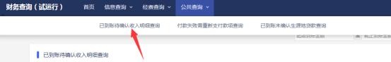 ★ 电脑版:登录WilliamHill体育“智慧财务管理平台”(学校信息门户或者WilliamHill体育网页均有登录窗口)--点击“公共查询”--“财务查询(试运行)”--点击左上角“公共查询”菜单中“已到账待确认收入明细查询”--右上角空格内输入关键词(金额、付款单位名称、款项内容等),全表模糊搜索。